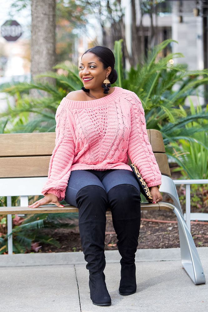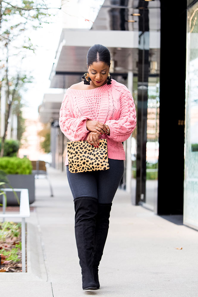 Sweater: Express (currently on sale) // Jeans: Similar, Similar // OTK Boots: DSW // Clutch: Nordstrom // Earrings: JC Penney