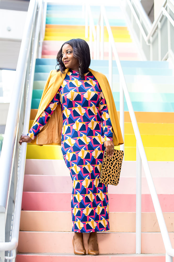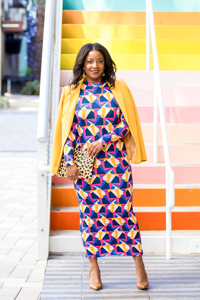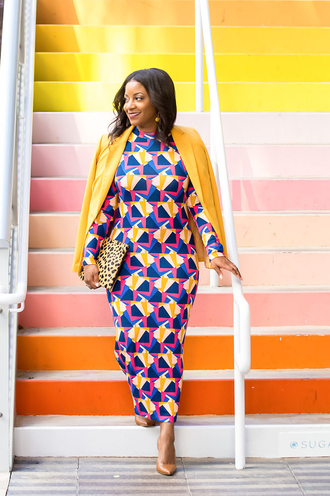 I took these pics in front of the Sugar and Cloth stairs in downtown Houston. If I didn’t already have a post called “Doing the Most,” that would have been the title of this post! Here we have a printed dress mixed with a different print clutch mixed with a colorful background. If that’s not doing the most, I don’t know what is. It really is a colorsplosion, maybe even a printsplosion too! I toned it down with the neutral shoe (in my skin tone to elongate my leg) and a solid yellow blazer b/c there’s nothing wrong with color on top of more color! Have you shopped the Tracee Ellis Ross for JC Penney collection? If so, what’s your favorite piece?