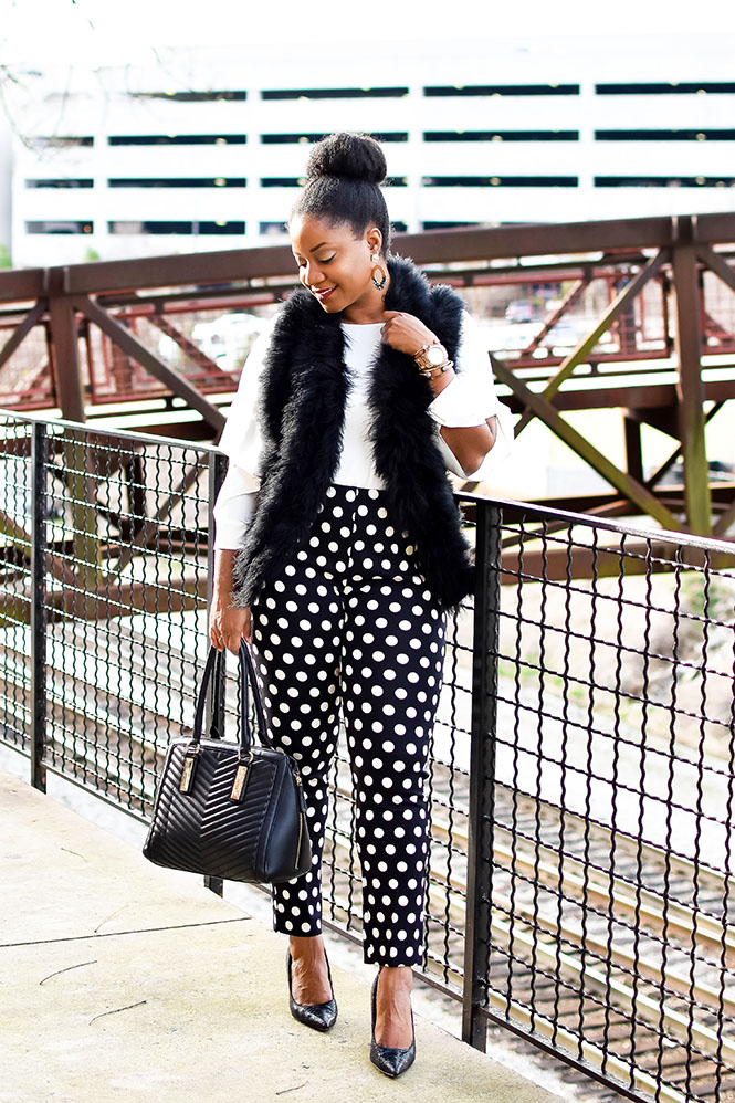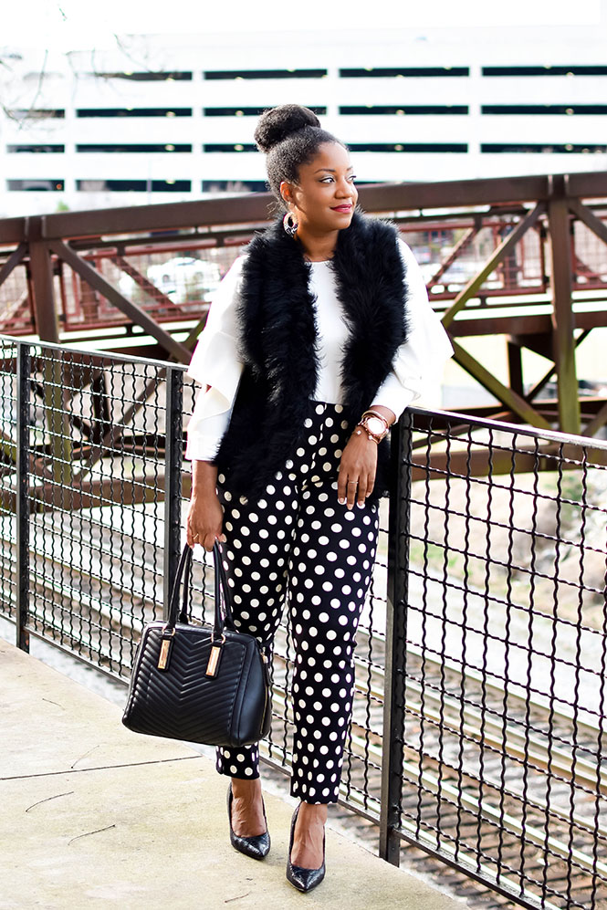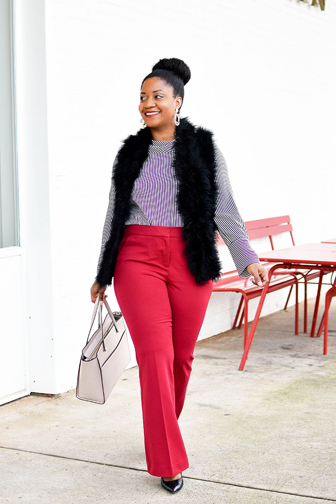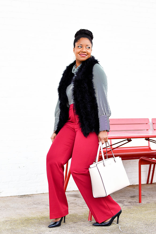 The feather vest – I love this vest and it pairs so well with many different looks. It’s currently on sale, so a great buy! I paired the vest in two ways in this post. First, with the polka dot pants, then with the red pants! Would you rock a feather vest?