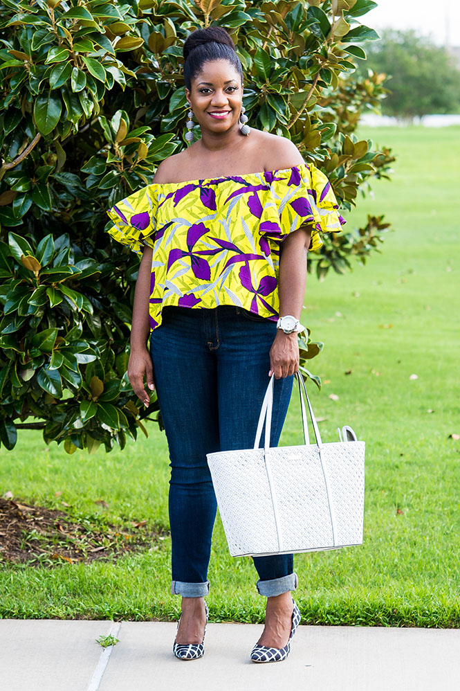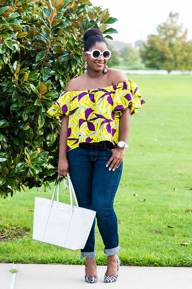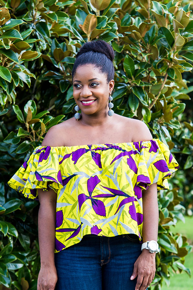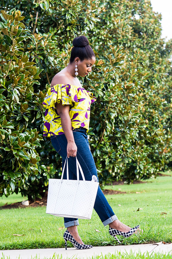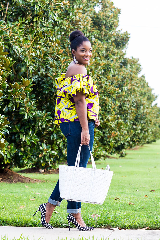 Today’s look, like in my last post, features another Chic Creations and Collections (3reeCs) design. How fun is this top?! I love the colors and the flounce sleeves. There’s a dress that’s coming to the blog soon, maybe next week, from Chic Creations and Collections that has the same fabric as this top, but is mixed with another fabric too….it’s super cute. You’ll know it when you see it, and, of course, I’ll remind you! Be on the lookout for that. Speaking of mixed prints, I am mixing a couple of prints in this look, like I like to do!! The way I’ve mixed the prints in this look is easy if you’re just starting out on the mixed prints bandwagon. If you look at the close-up of the top, you’ll see there is a part of the design that is white with black stripes. It wasn’t a great leap to add the black and white striped ball earrings to coordinate. Then I took a bigger leap to go for a different print and add the black and white grid pumps! I kept the mixed print in the same family of colors, black and white, which, come to think of it, seems to be my favorite color combination to use for mixing prints (as you can see here, here, and here). As I’m typing this, I realize I need to branch out more and try mixing prints with different colors, not just black and white! I’ve done it before here, but I need to do it more with bolder prints/colors. But for all you mixing print newbies out there, let that be a lesson to you…an easy way to mix prints, is to mix the colorful print (particularly if it has black or white in it) with a black and white print (like grid, or stripes, or polka dots, or gingham, etc). They mix well together.