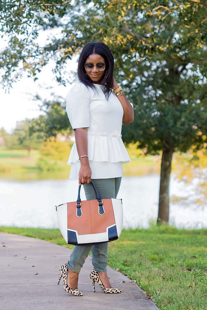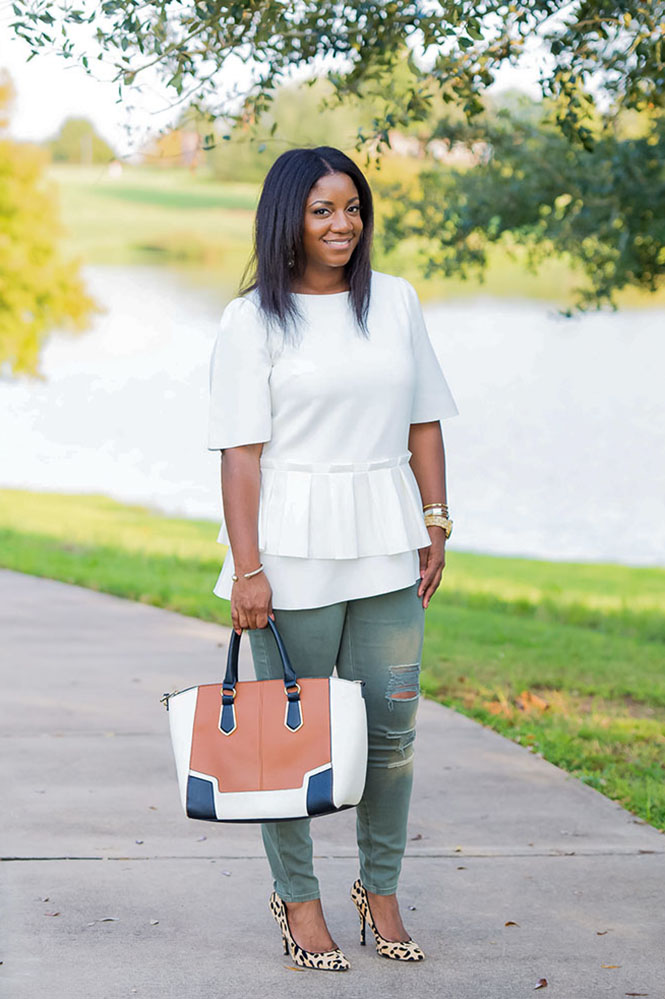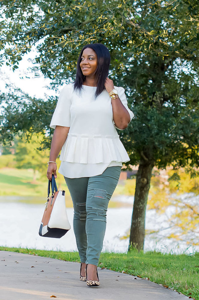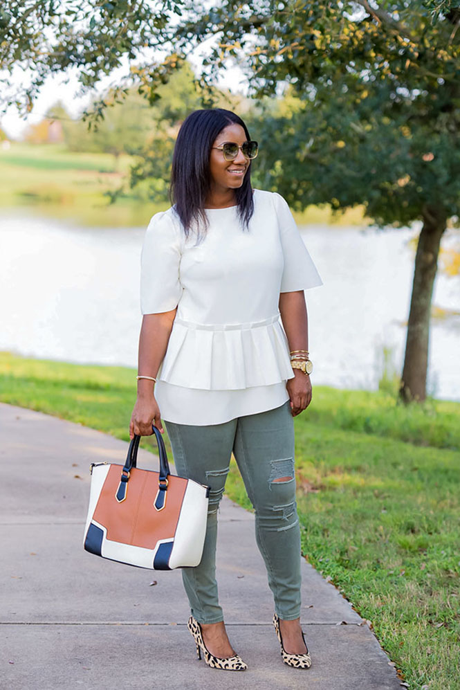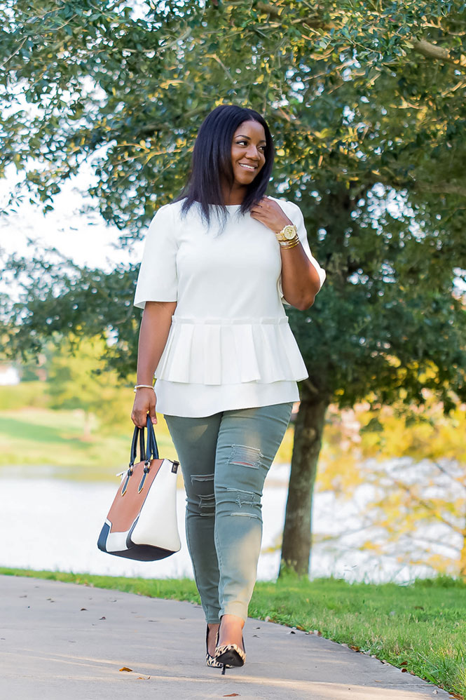 Anyway, I guess I should talk about this outfit!! I’m not sure I would categorize this look as effortless. Would you?? I guess it’s somewhat effortless. It’s just a top and jeans, but I think it has a little too much going on to be considered effortless. It certainly required very little effort to put together, so let’s call it effortless with an edge. But, I will do a post on tips for achieving effortless style in the future. I’ve mentioned this top before. It’s from the Olivia Palermo Collection for Banana Republic. It’s one of the pieces I really wanted when I saw her runway show in NYC. Unfortunately, it’s sold out now, but her collection still has a lot of great pieces! I’ve linked below to somewhat similarly styled shirts. Obviously this shirt is pretty unique, so I wasn’t able to find an exact match. But I loved the idea of pairing a unique blouse with an equally unique pair of pants. My first thought was to pair the top with my usual blue jeans or my black ankle pants, but I wanted to try something different. I seriously love these oregano colored destructed jeansll (which are on sale right now for under $25). They are fun, and I love how they fit. I added my fave leopard pumps and other fun neutrals, and the rest is history. Would you put together this combination? Have a great week, and thanks so much for reading!!