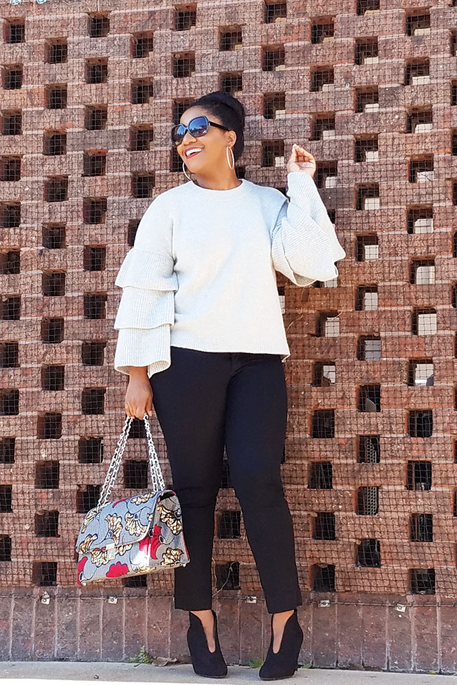 This look features the same shoes from Target as in the first pic. I love these booties, and they are pretty comfortable. I mentioned in a previous post that I was on the hunt for ankle boots/booties that would flatter my legs, and I think I’ve found them!! I bought this pair shortly after that post was published. I am looking forward to wearing these booties with skirts/dresses because the front slit will help elongate my leg rather than cut it if off like most booties do. The sweater I’m wearing is also from Target. It’s super comfortable, and I adore the tiered sleeves!! I wore this look to church, and someone who hugged me thought the sweater was cashmere.
