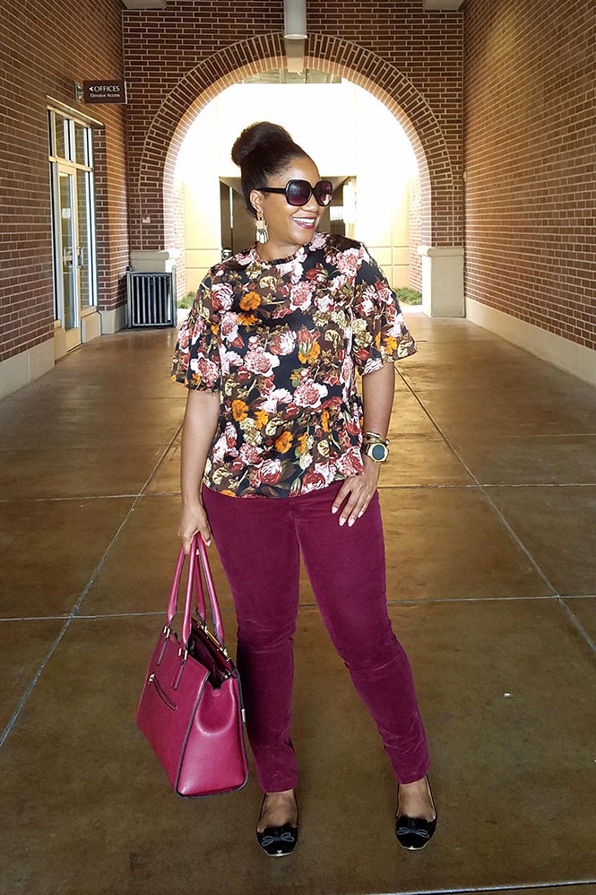 A week or so ago that I was feeling very fall-like, I wore this look to work. I love the color combination. I actually bought the floral blouse from H&M as an emergency shirt one night that I was headed to a blogger event. I had decided that the shirt I was wearing looked horrible and not worthy of attending an event where I needed to look decent. Since the event was right across the street from an H&M, I figured I would head over to the store early to try to find something. Am I the only one that would do something like that? Lol. Probably not. Anyway, it worked out. I love this blouse. It’s the perfect style for me because it’s not fitted, the print is fun, the colors are pretty, and it also has a unique peplum. For this look, I paired the blouse with my corduroy pants that you may remember from this post.