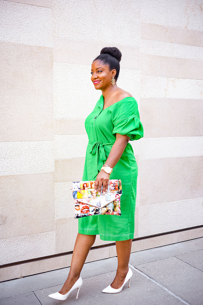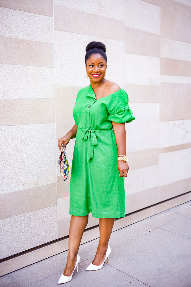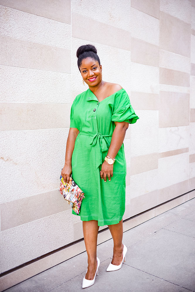 So, here’s the story: I got this dress at Target awhile ago because I was drawn to the color. I love how pretty and green it is, and I love the button detail. However, when I got home and tried it on, I hated it. In particular, I hated the sleeves. Yes, the Queen of Sleeves hated these sleeves! They were boxy and not particularly flattering. And on top of that, the fabric is not comfortable! I almost didn’t post this look at all because I didn’t want y’all to go out and buy it since I’m not a fan, but that’s up to you! Apparently, some people like this dress. Anyway, back to my story. I intended to return it, but at some point, I removed the tags and I couldn’t find them anymore and so much time had passed, I figured I was just stuck with it. So, naturally, I tried to figure out how I could make it work, and I decided to get creative! I figured since the top was my major problem with the dress, maybe I could figure out how to style it differently. So, I unbuttoned the buttons and was thrilled to find that I was able to fold one side in to create an off-the-shoulder look that I actually love out of a dress I don’t love.