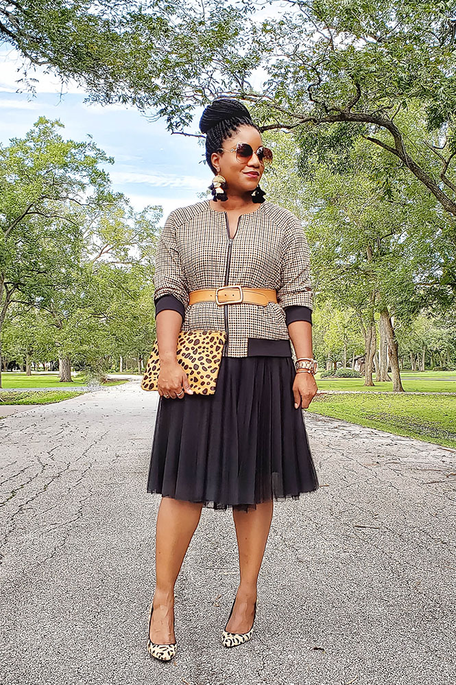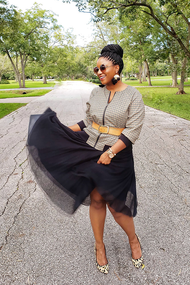 Oh yeah…before I forget, let me talk briefly about the look for today! Isn’t it gone with the wind fabulous? This look was inspired by one of my blogger friends. She posted a similar look, and I loved the idea of belting a blazer and pairing it with a tulle skirt. In this instance, I decided to try belting a bomber jacket. What are your thoughts? Would you try belting a blazer?
