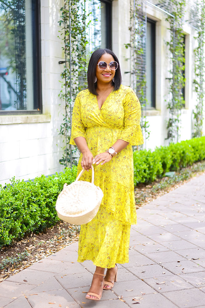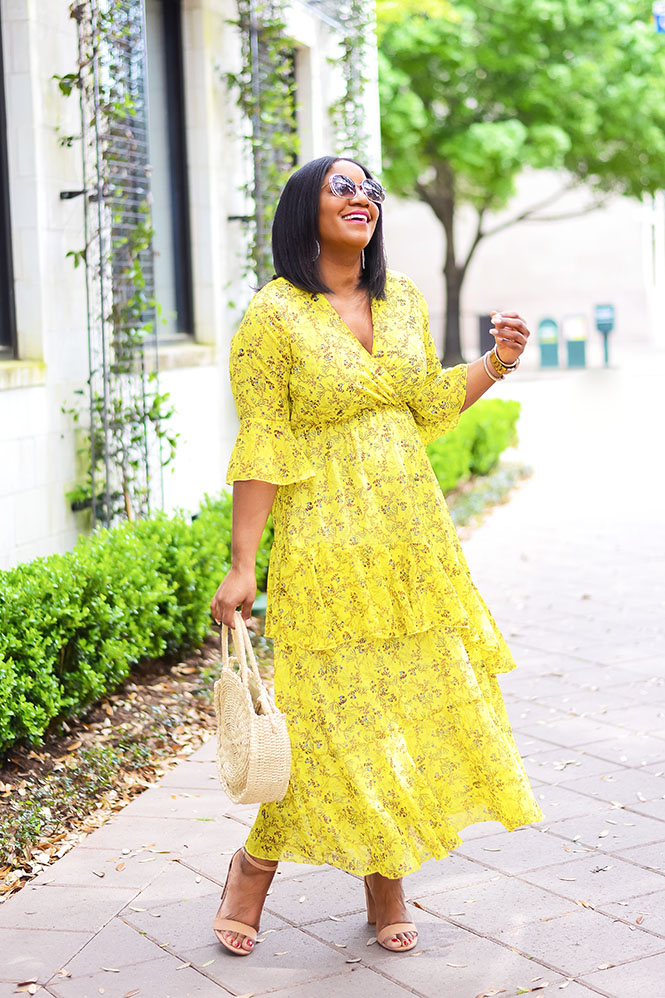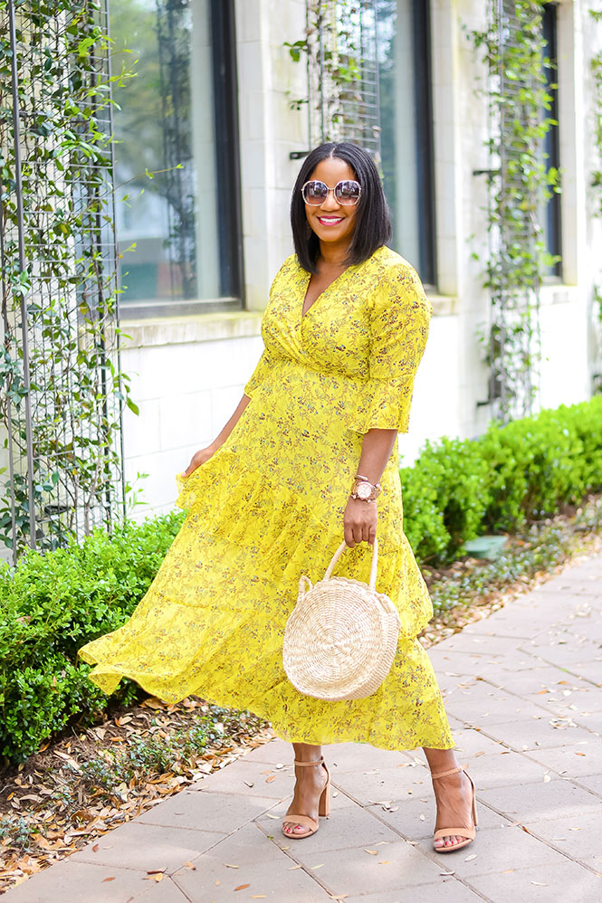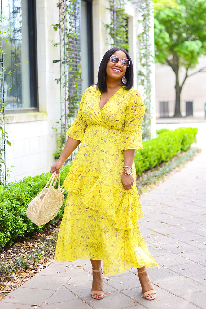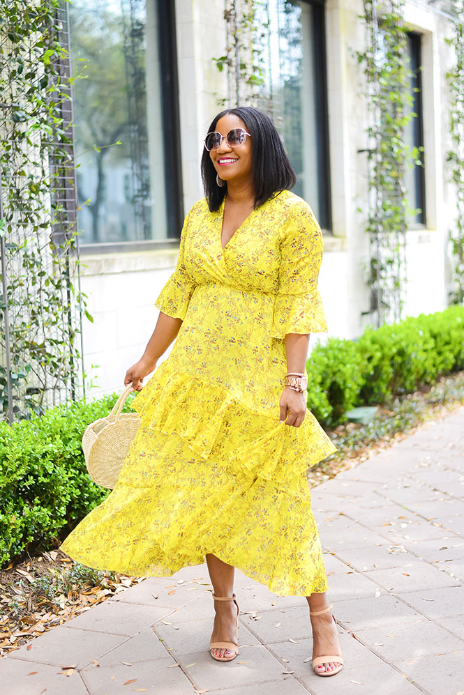 This gorgeous dress is another Amazon find! Is it not the most beautiful, flattering, romantic dress you’ve ever seen?!! Hyperbole aside, I really love this dress and, to be honest, I was surprised at how great it turned out! I found it one day while I was searching on Amazon, and I dropped it on my wishlist for later. I wasn’t sure how it would look on because there were no reviews yet, so no pictures of other people wearing it. P.S. That’s one thing I love about Amazon…the reviews! So many people are willing to leave reviews with pictures and that’s so helpful when trying to figure out what size to get and how something will fit. Anyway, even without the reviews and pictures, I decided to chance it! Y’all know yellow is my color, and I loved the chiffon and ruffles. I’m wearing a size L for reference. This is a PERFECT dress for Easter Sunday, it’s also great for any spring event – weddings, brunches, baby/bridal showers, Kentucky Derby, or any other events where the dress code would call for a pretty dress. I’m seriously thinking that this yellow ruffle dress will be my Easter dress this year…so pretty. I even got several compliments when doing this shoot!