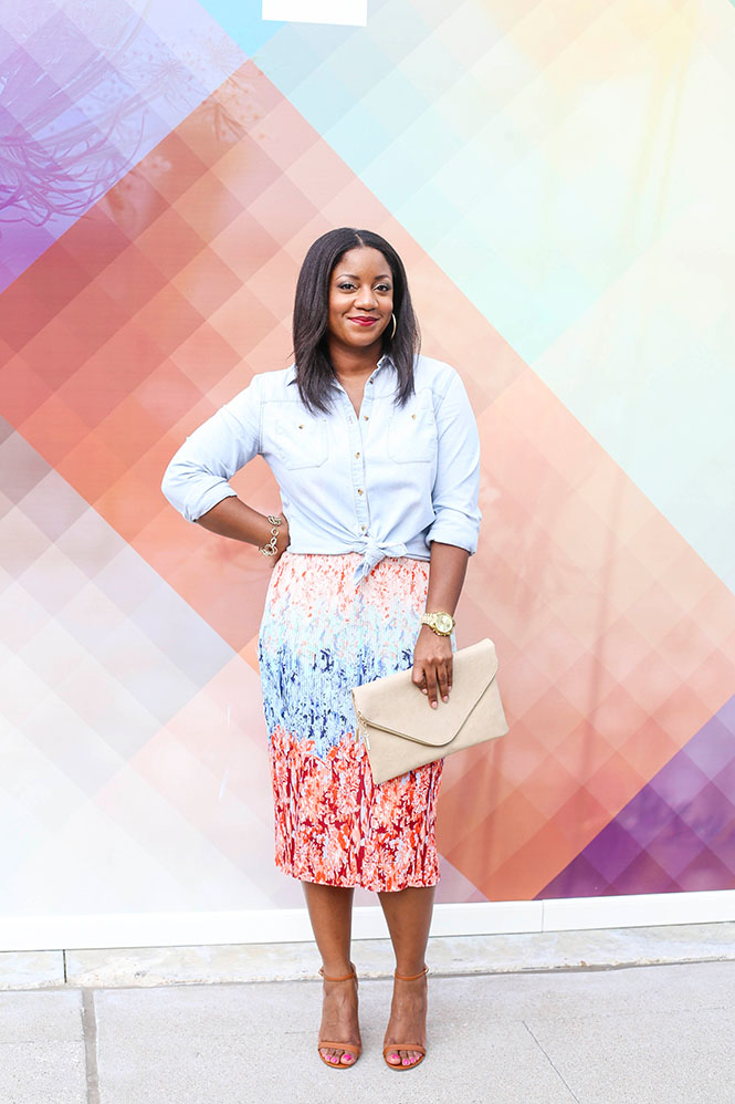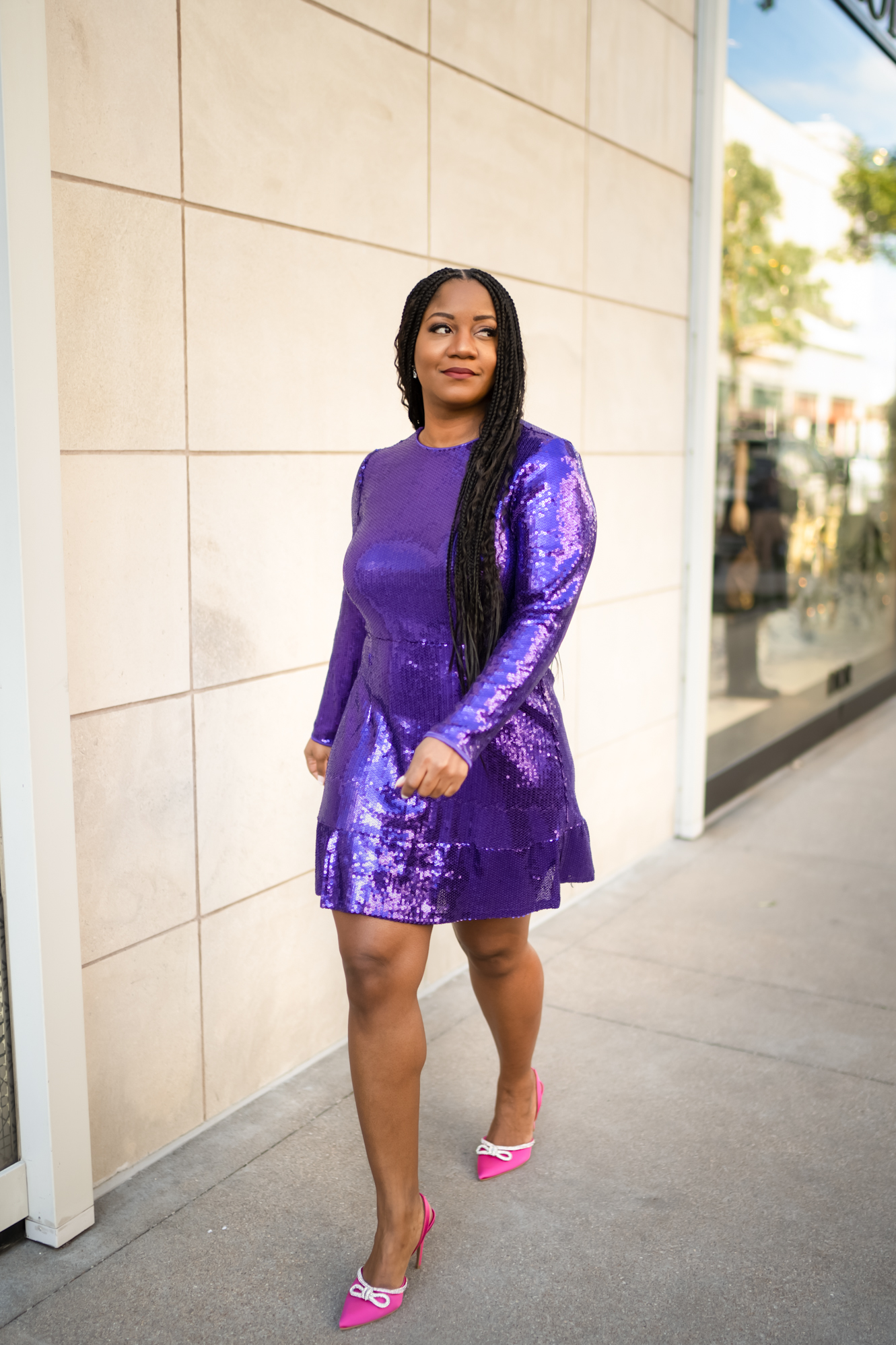 For my third look, I went with a pop of color! Purple and pink pair so well together, so I thought it would be fun to add gorgeous embellished sateen pink pumps for a fun look! The straps on these pumps are a little loose so you may need to get the straps shortened or secure them to your heels with fashion tape.