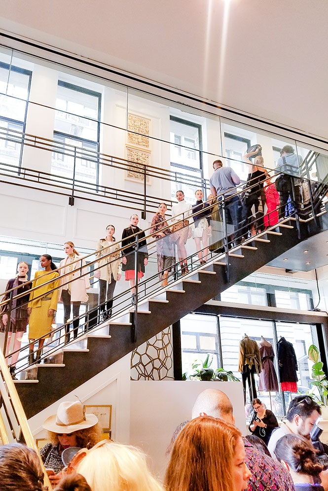 So, then the show started. If you follow me on Instagram, I streamed the show live on my Instastories. The models walked briskly around the room showcasing Olivia Palermo’s Fall 2017 Collection for Banana Republic. The looks were SO chic. There were a lot of military and bohemian details. I loved everything about it! After the models went around the room, they went outside to pose on a stage in front of the store. Apparently, while they were out there, someone tried to jump on the stage, so the models came back inside and lined up on the stairs. The entire time they were up there, photographers were going back and forth, so I never got a clear picture of all of the looks.