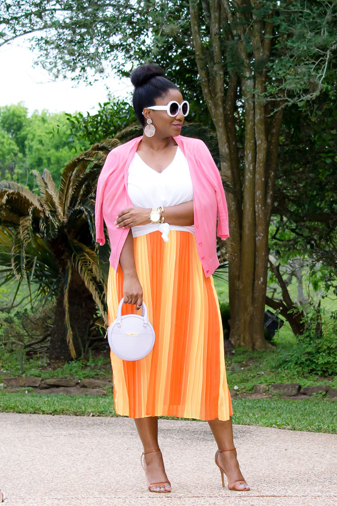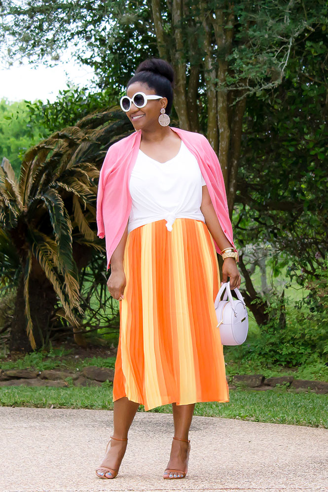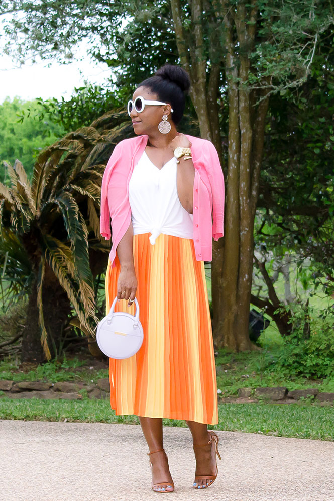 Originally my plan was to pair this fun NY & Company skirt with all yellow…a yellow shirt, yellow shoes, etc. I was going for a monochromatic look, but…it looked kinda cray, not gonna lie. Lol. Perhaps it was the shirt I chose. I still think it could work in theory. But anyway, I had to pivot and readjust my plan, so I decided to go with a white tee instead. I headed over to Old Navy and bought this tee. I’ve been on the search for the perfect tee, and this is pretty close. I love the shape of it. Because the hem is rounded, it ties in the front with ease. After I paired the tee with the skirt, the look still felt incomplete to me. It still needed something else, so I thought a cardigan would be a fun addition. I saw this coral one in my closet, and I knew it would be perfect…and it was. 🙂