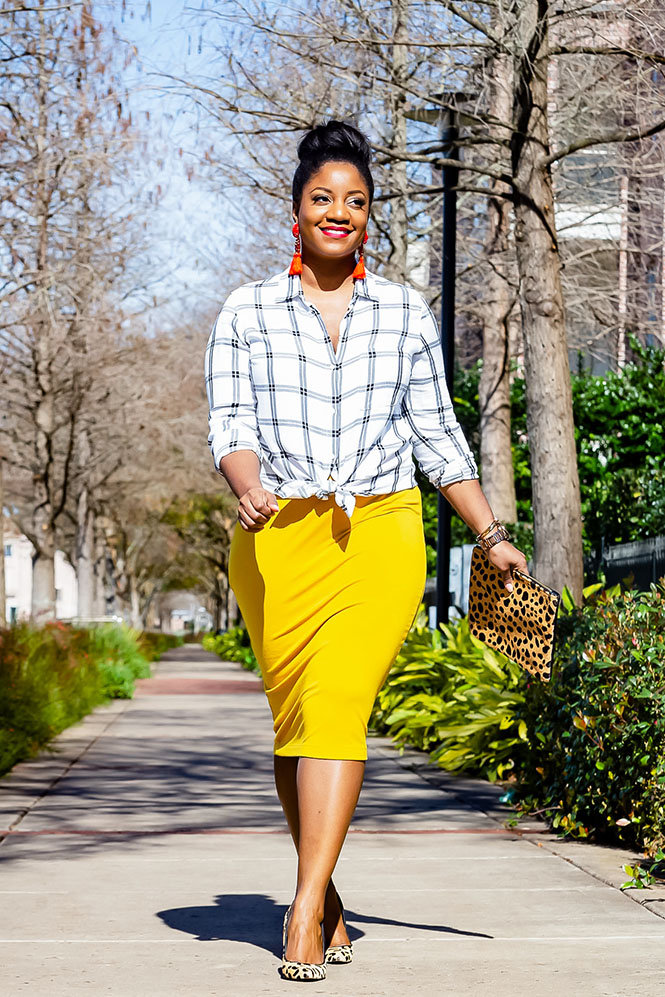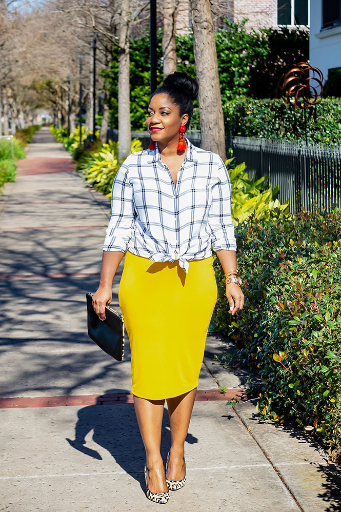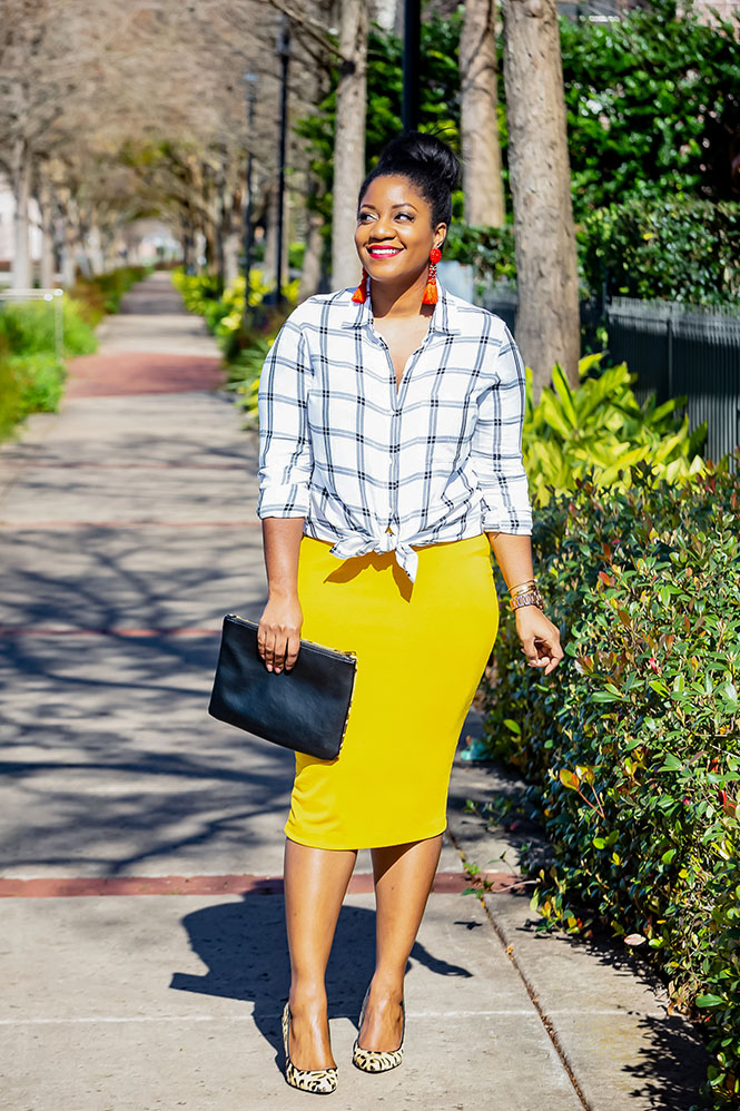 This look was inspired by a blogger I follow on Instagram. Check out her post HERE (first and second pics). I loved that she paired her black, white, and yellow looks with red shoes and earrings. Unfortunately, I don’t own similar red shoes that would have worked for me, but I had similar earrings (my earrings look somewhat orangeish in the pictures, but they are a true red in real life)! And you know I love mixing prints, so I decided to throw on my leopard pumps instead of red shoes. I’ve talked about this before, but here is another reminder that if you are a print-mixing beginner, start by mixing classic prints in neutral colors together or adding in another print through your accessories, like in this look.