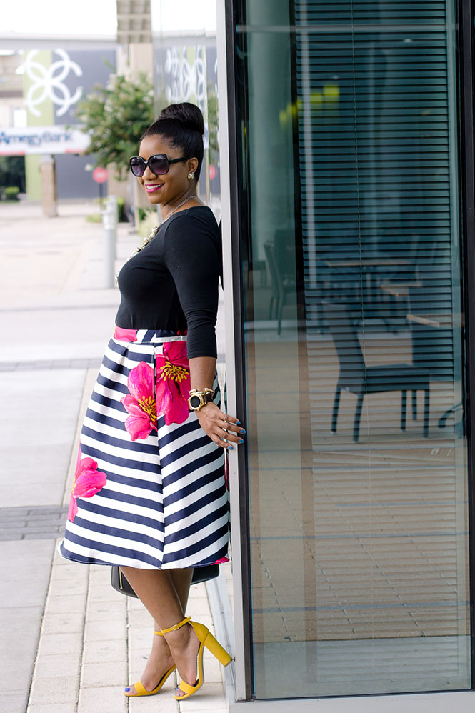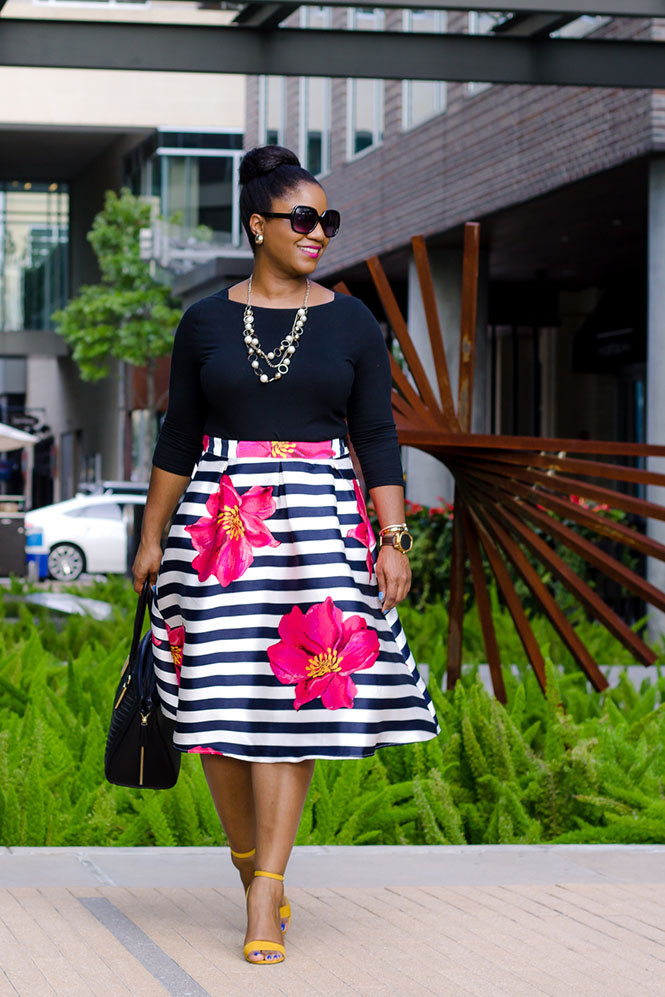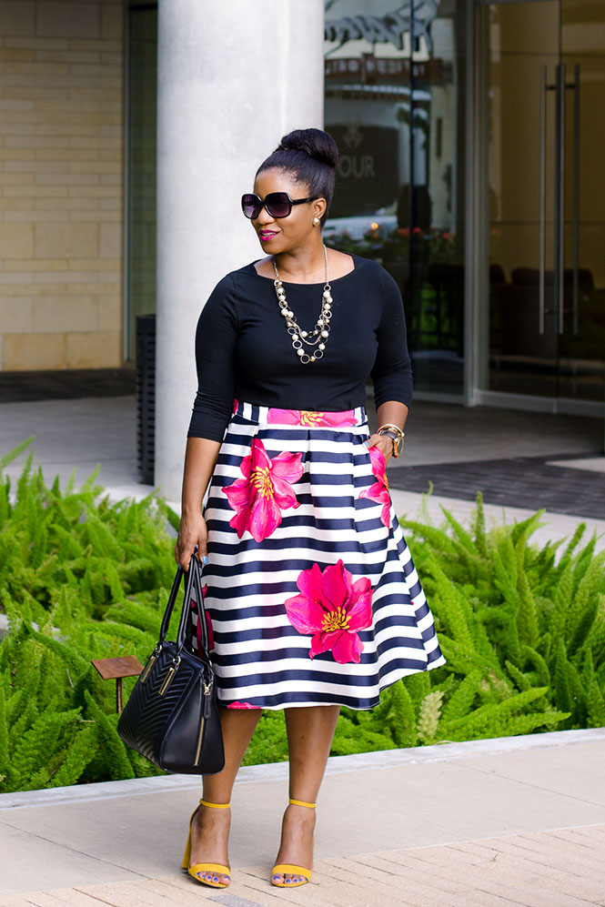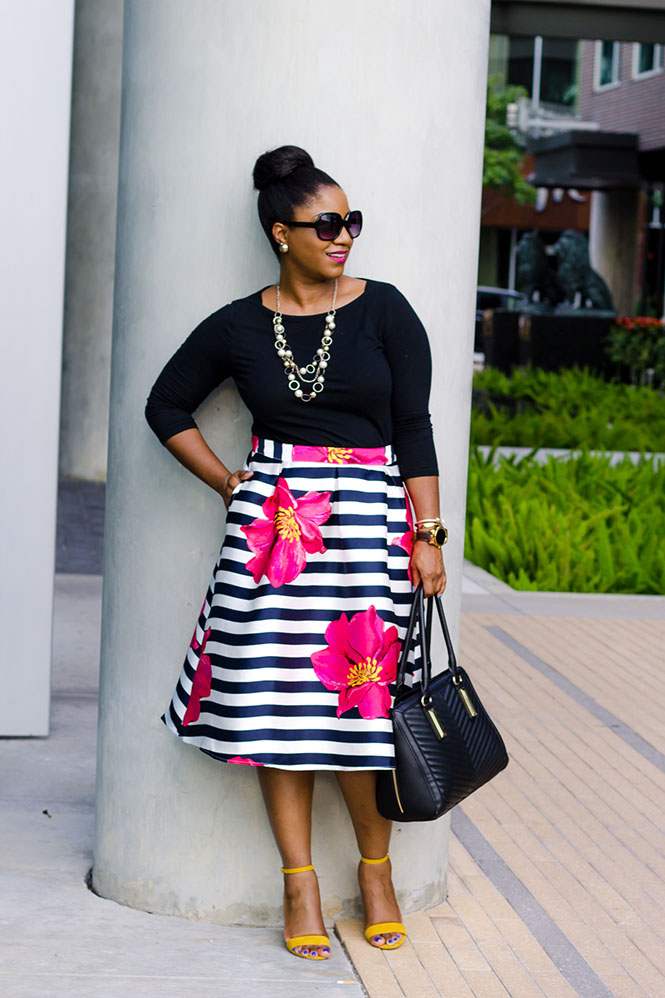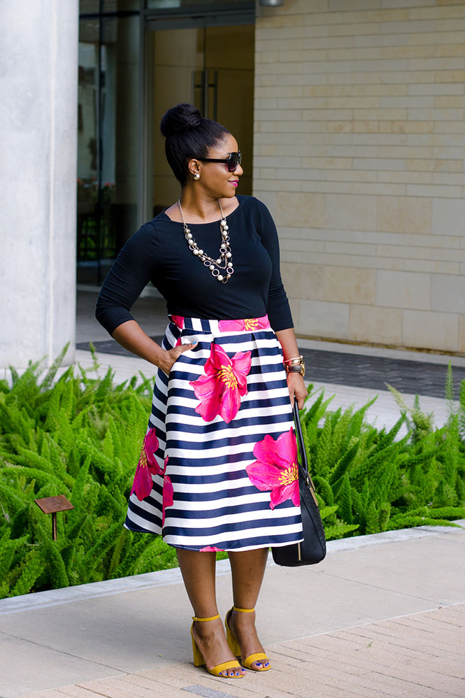Anyway, on to memories of better times. I wore this look last week to a happy hour event with some of my blogger boos. Some of you may have seen it on my Instastories. I was super excited to wear this outfit! I actually purchased this striped floral midi skirt the day before the event. Are any of you familiar with the Houston tunnels downtown? Well, I work downtown and sometimes I head to the tunnels for lunch. There are many restaurants and stores down there. On the day before the event, I traveled to the tunnels to visit the shoe hospital, so I could get some heels of mine fixed. I passed by the cutest boutique that had this skirt!! It’s so stinkin amazing! Is it not? And it was under $40. Since I got it from a random boutique, I can’t link to this exact skirt, but I’ve linked to some similarly beautiful skirts below! I love the touch of yellow in the skirt, so of course, I had to pull out my fave yellow block heels to wear with it! I plan to take the skirt with me to New York and wear it to fashion week events (if I go). I will style it in a completely different way…maybe I’ll mix prints or add new, fun colors! We’ll see! Stay tuned for that!