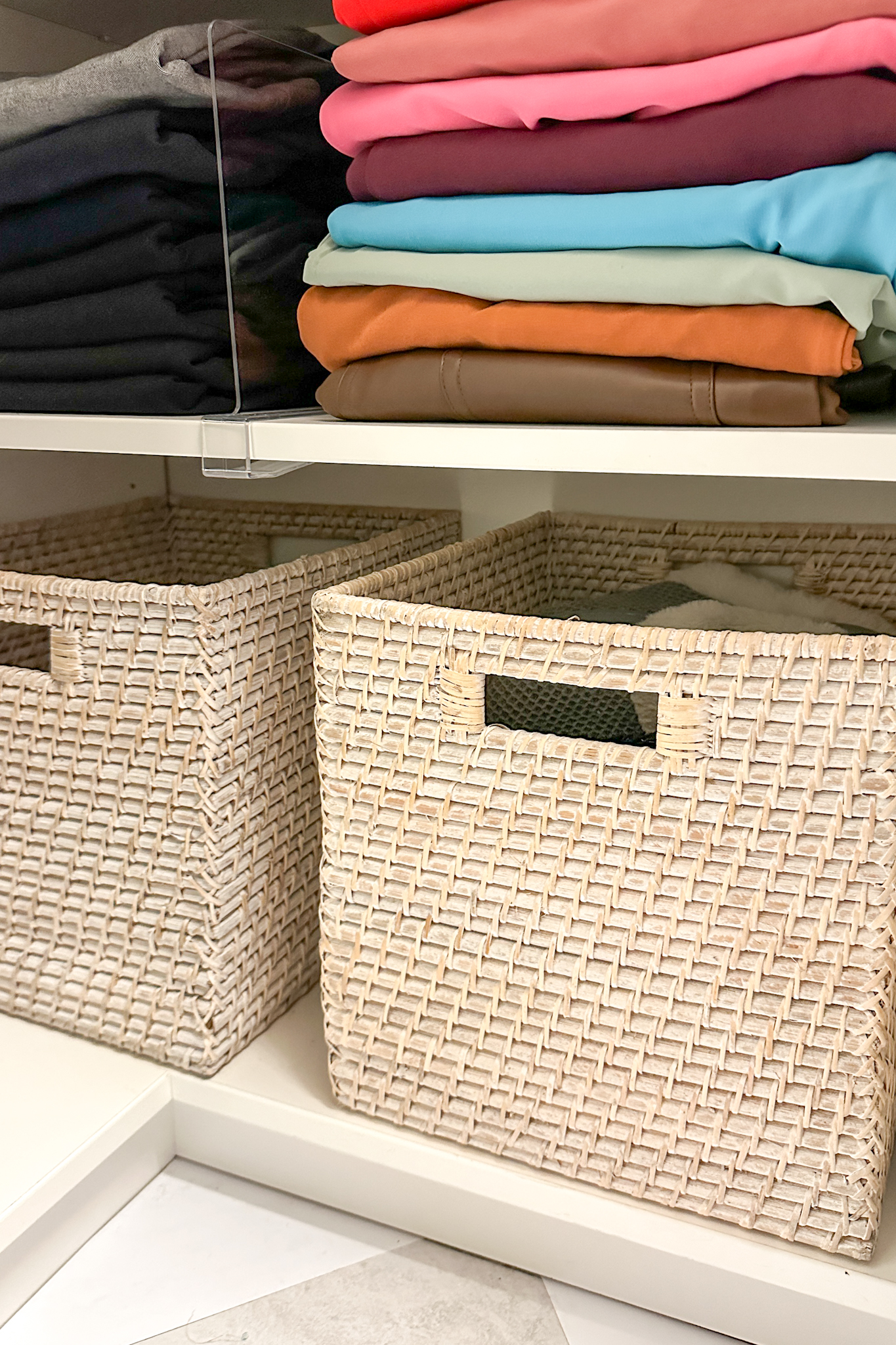 These shoe stackers help keep my shoes organized while also saving space. They allow me to fit so many more shoes on my bottom shelf, and they’re so easy to assemble. Depending on your shoe storage needs, there are also rotating shoe towers, tiered shoe shelves, and plastic foldable shoe racks. They also make stackable plastic storage bins that have magnetic lids, keeping your items dust free.