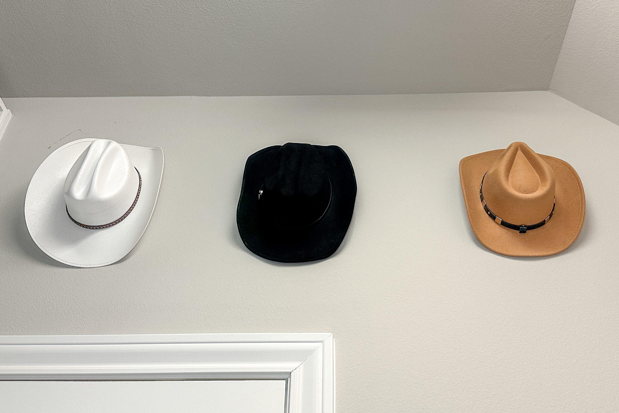 I added hat hooks to my wall for extra hanging space. You can also use wall-mounted hooks for your handbags that have straps and handles, too. Depending on your needs, you could scatter individual and various-size hooks on your wall or get a wall-mounted plate with several hooks on it for additional storage.