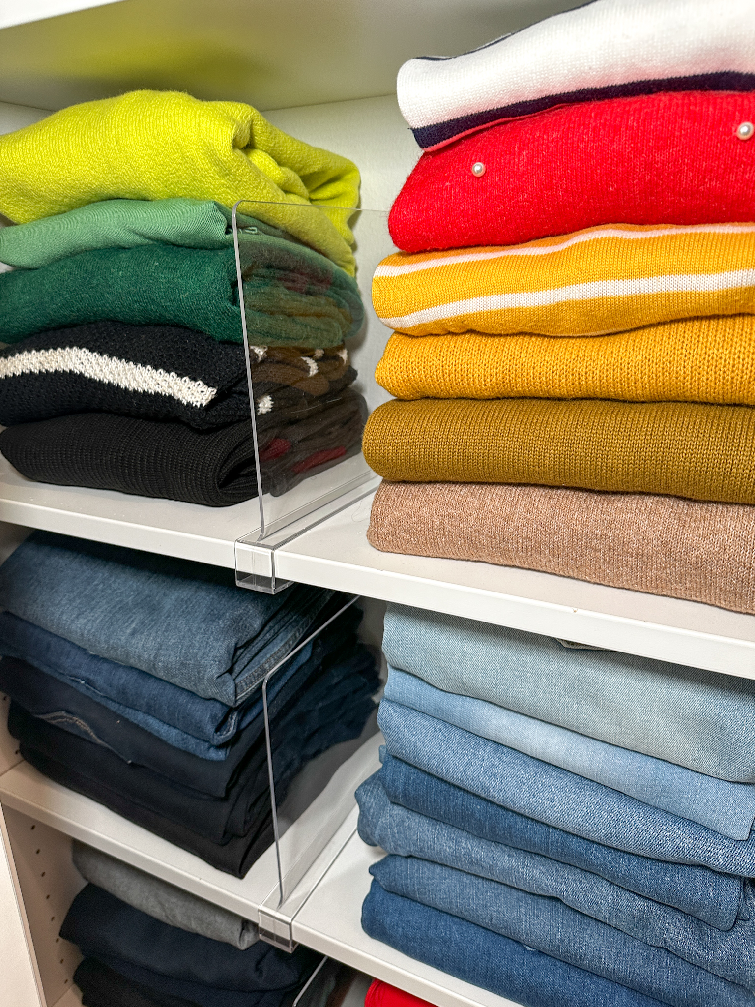 I purchased clear acrylic shelf dividers for handbags and folded clothes. At first, I didn’t think they would make much of a difference, but I was pleasantly surprised. The purse organizer offers support for both my structured and non-structured bags to help them stand upright. The acrylic shelf dividers are perfect for my folded clothes, like denim jeans and sweaters. And, I love that if I want to fit more on my shelves, it will keep everything pretty and organized.