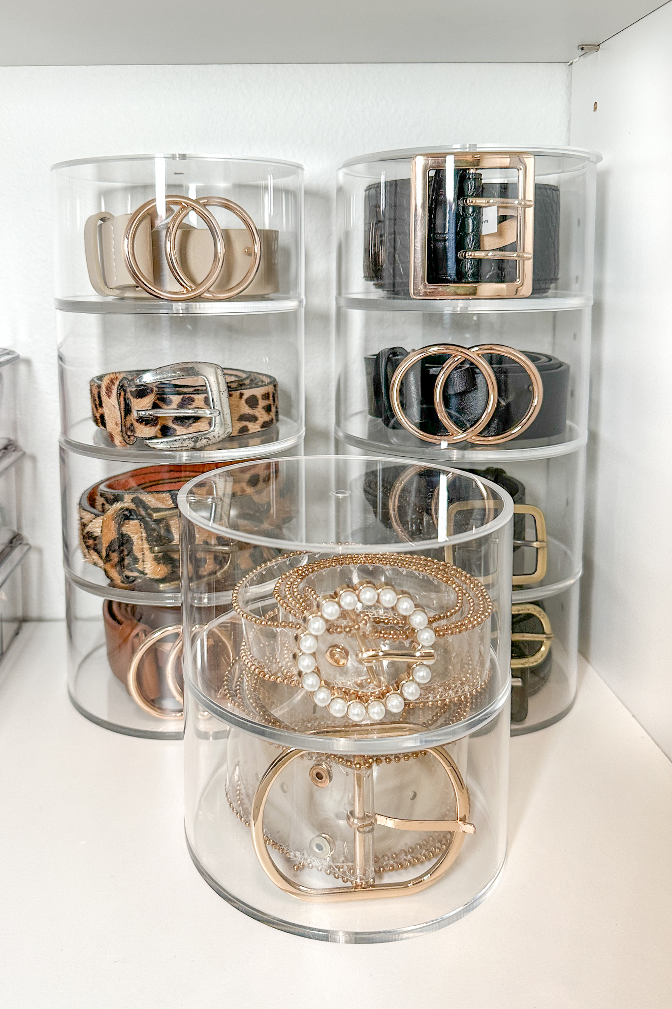 I store my belts a couple of different ways depending on the style. I use a belt organizer to neatly display a few of my favorites, and I also hang several belts on a belt hanger to keep them visible and easy to grab. If you’re short on hanging space, rolling your belts and storing them in a drawer is another great option—just roll them with the buckle on the inside to prevent scuffing.