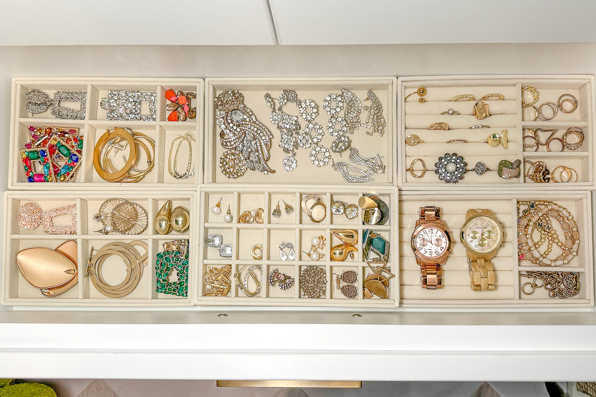 For organizing your jewelry in a drawer, I suggest a stackable jewelry tray with dividers. This jewelry tray allows you to lay everything out in a neat and organized manner. An added benefit of having everything in a jewelry drawer is that it isn’t as exposed to the elements and will last a bit longer. I put these trays in my new closet drawer system, and I’m loving it so far.