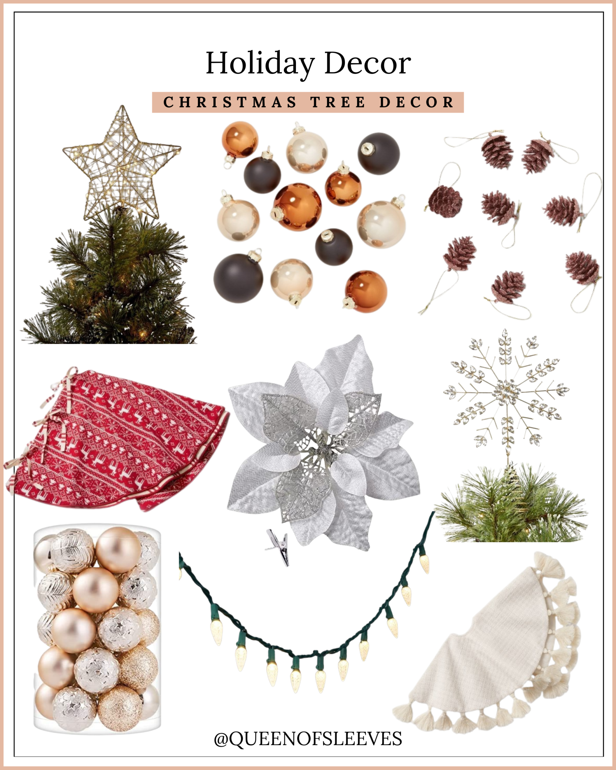 Since my Christmas tree is my largest holiday decoration, I love going big! From the ornaments to the tree topper, lights, and tree skirt, I love it all! I love having a gorgeous, color-cohesive tree with coordinating ornaments and a color theme! Last year, I had a theme of gold, champagne, and white. Check out my Christmas tree from last year HERE! I can’t decide if I want to change up my tree topper this year, but if I do, there are so many options to choose from! You can choose from a snowflake, angel, star, and more to make it the highlight of your tree! I personally love white lights but if you prefer more color, colorful lights are always fun. Some of my favorite places to buy ornaments are At Home, Amazon, and Target! There are so many cute, festive options to make your tree shine!