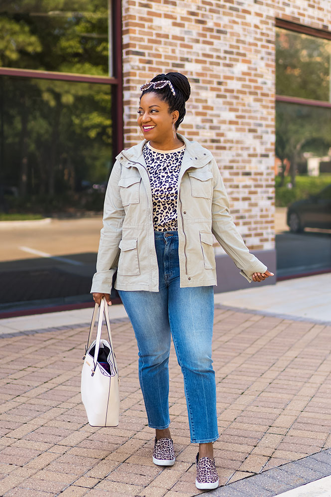 I’ve been on the hunt for booties and sweaters and such, and along the way, I picked up this great utility jacket from Amazon. I have one that’s a darker olive color (from another store), and it’s one of my favorite casual jackets. It’s my preferred jacket to travel with, so I love that I have a new color now. It also comes in several other colors too. I kinda want to get the pink one! Anyway, I paired the jacket with this fabulous $12 tee that you all need and my favorite leopard slides. This is not a sponsored Amazon post, but I picked up this whole outfit from Amazon! I bought the jeans for my recent trip to Seattle, and I really love the fit. I love that they’re high waisted, and I wear them all the time! I’m wearing a size 31 for reference.