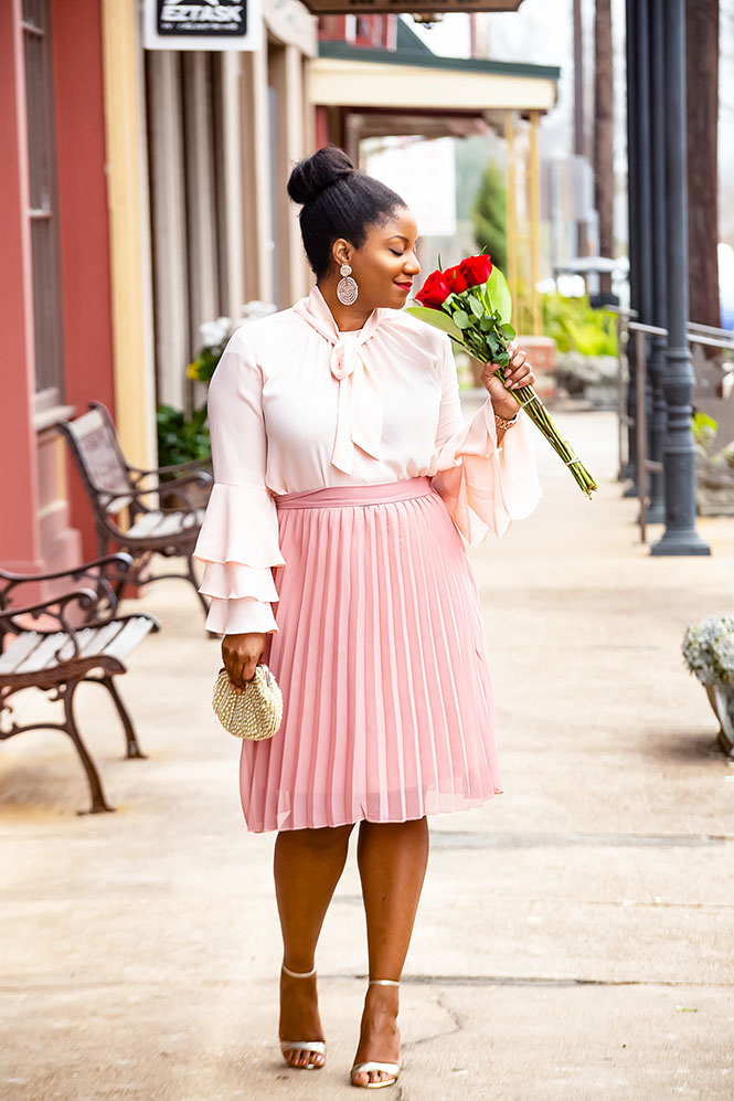 Hi, Friends and Sleevenistas! You’re making me blush! 🙂 Speaking of…how gorgeous is this blush outfit?! This look is perfect for a Valentine’s Day date night or Galentine’s brunch or get-together. It’s also a great outfit for work, church, or to wear to a wedding! I love pairing two (or more) shades of the same color together in one look. It always turns out so beautifully in a monochromatic way. This week, look in your closet and try combining two or more shades of the same color into one look, then let me know how it turns out!